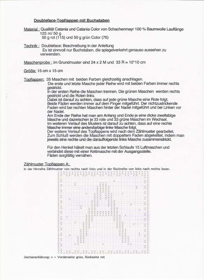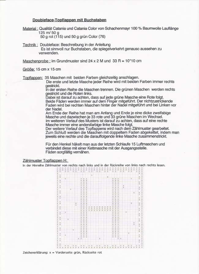 Douleface-Topflappen mit Initialen | Vorderseite: Rückseite:![]() ![]() Anleitung: Zählmuster: ![]() ![]() | Vorderseite:Rückseite:![]() ![]() Anleitung:Zählmuster: ![]() ![]() |