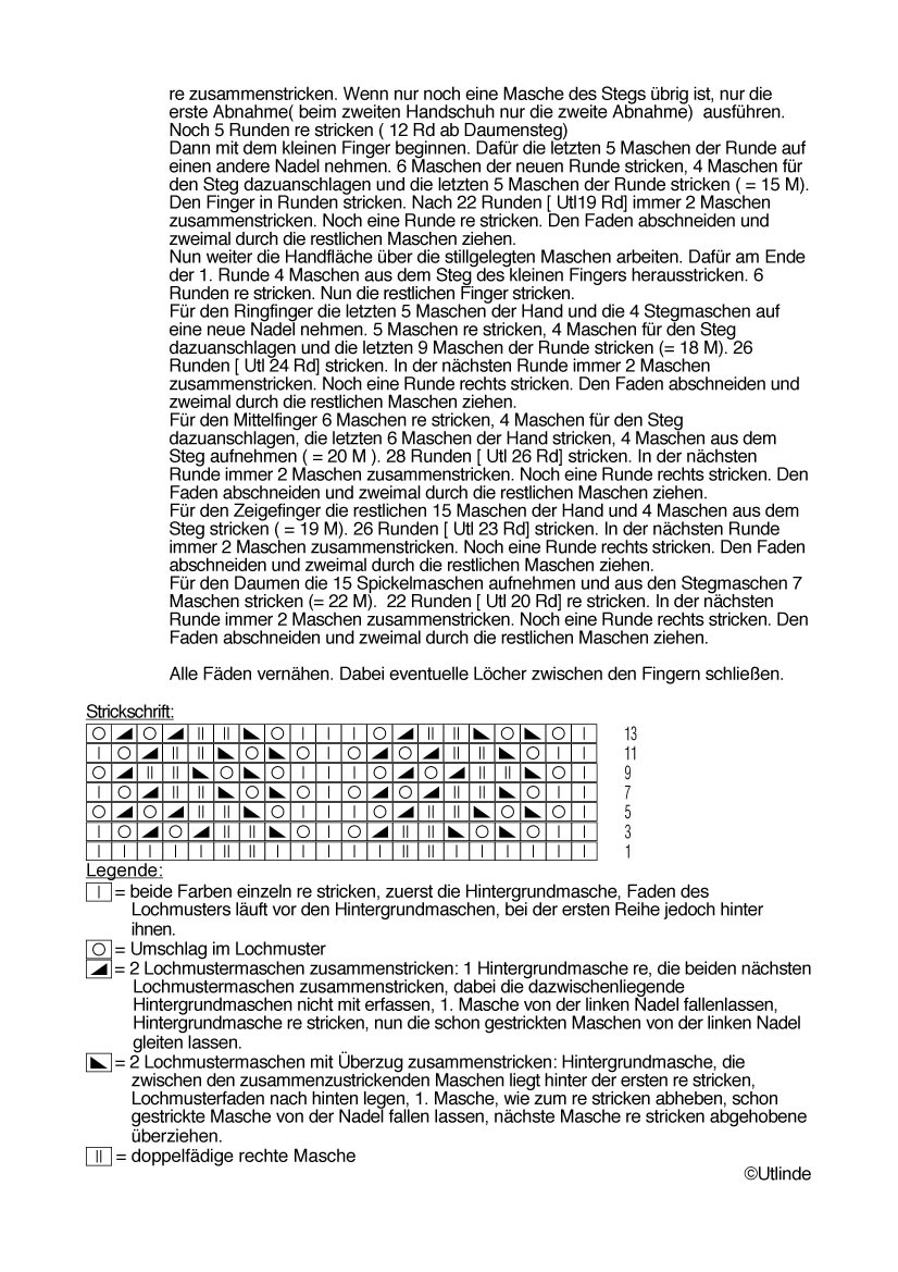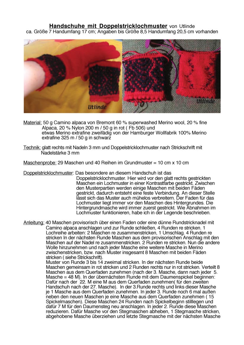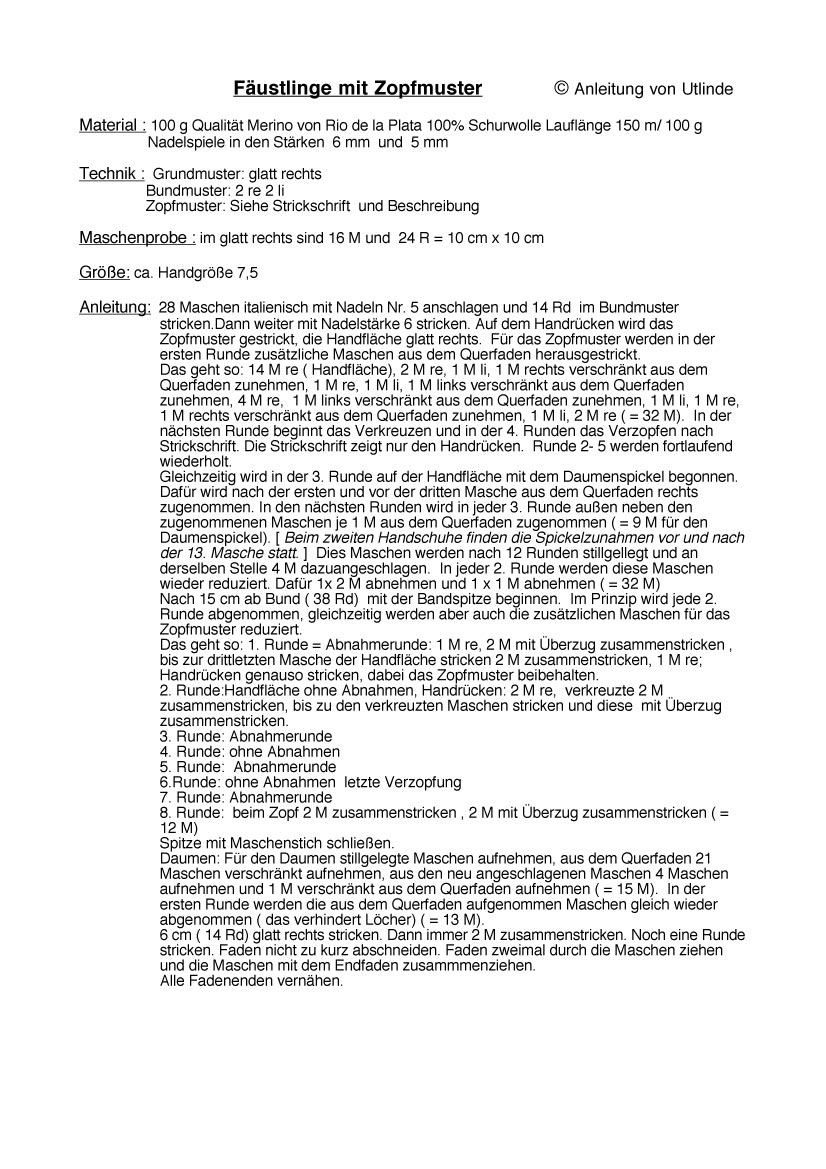 Fäustlinge mit Zopfmuster:![]() Anleitung: ![]() ![]() | Handschuhe mit Doppelstricklochmuster Größe 7 mit Angaben zu größeren Größen![]() Anleitung: ![]() ![]() Seite 3 ( Angaben zu größeren Größen) | Cuscoja Handschuhe in Größe 6,5 -7; 7,5 und 8 Der zweite Handschuh ist spiegelbildlich. Preis 3,50 € Ravelrykauf The pattern is also as english translation available. |