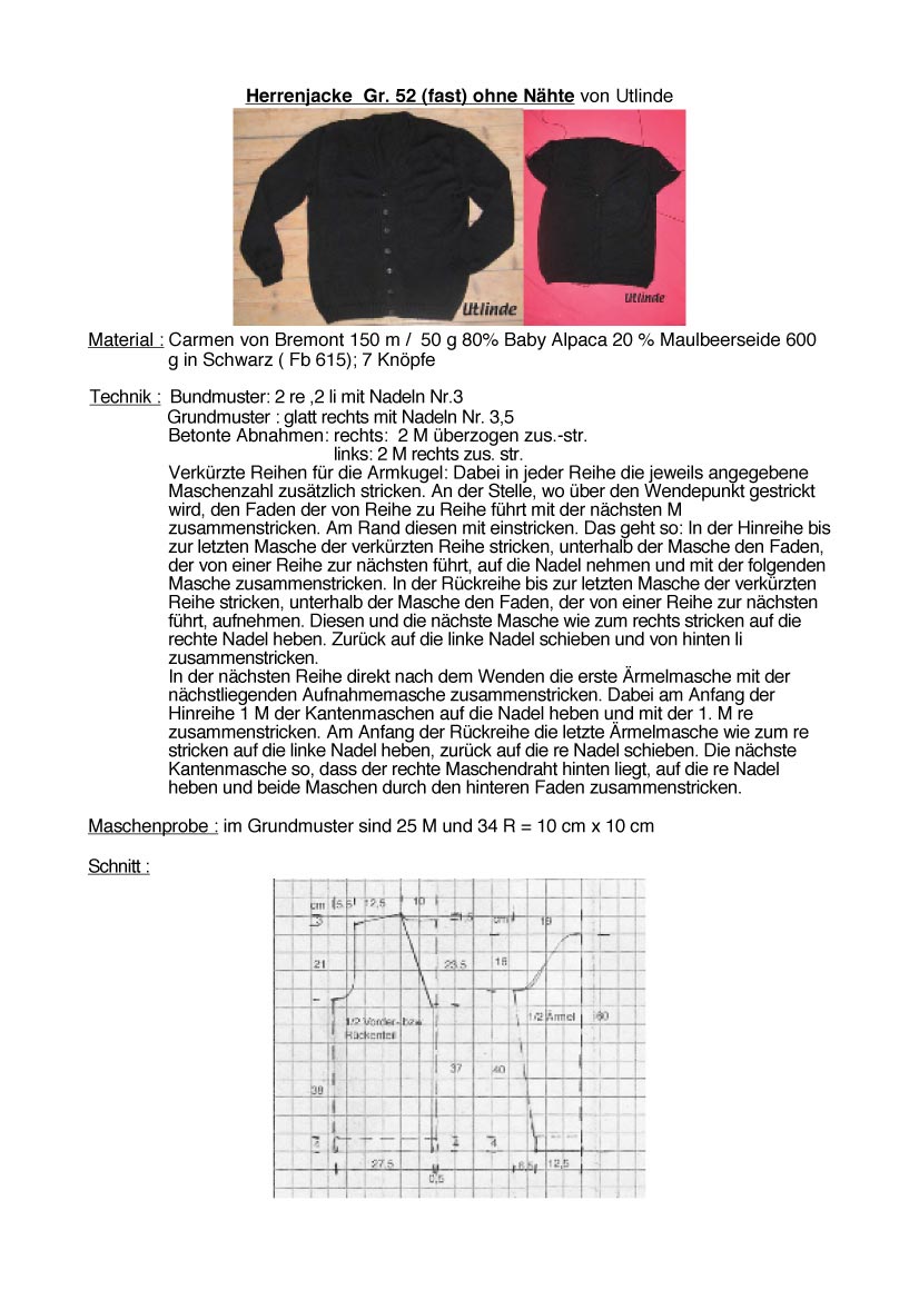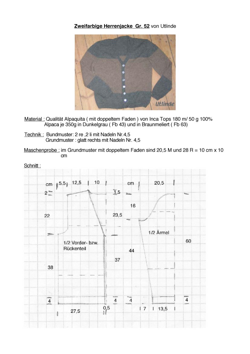 Herrenpullover aus Merino: Herrenpullover Gr. 54: ![]() Schnitt: Anleitung: ![]() ![]() | Zweifarbige Herrenjacke Gr. 52![]() Anleitung: ![]() ![]() | Herrenjacke Größe 52: Diese Jacke hat nur Schulternähte. Die Ärmel sind mit Armkugel von oben direkt eingestrickt.![]() Anleitung: ![]() ![]() |