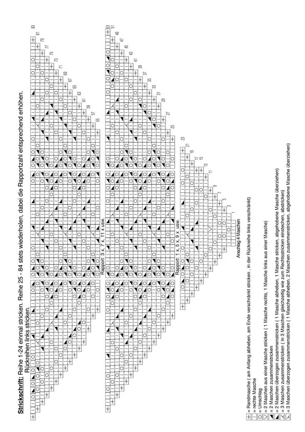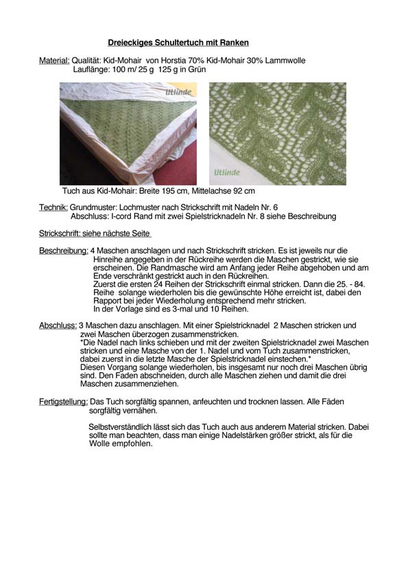 Dreieckiges Schultertuch mit Knospen:![]() Muster: Anleitung: ![]() ![]() | Dreieckiges Schultertuch mit Ranken (Rankentuch): ![]() Anleitung: ![]() ![]() | Dreieckiges Schultertuch: Aufstrebende Ranken:![]() Anleitung verfügbar als Ravelrydownload . Sie besteht aus drei Teilen. English translation as Ravelrydownload available. |
